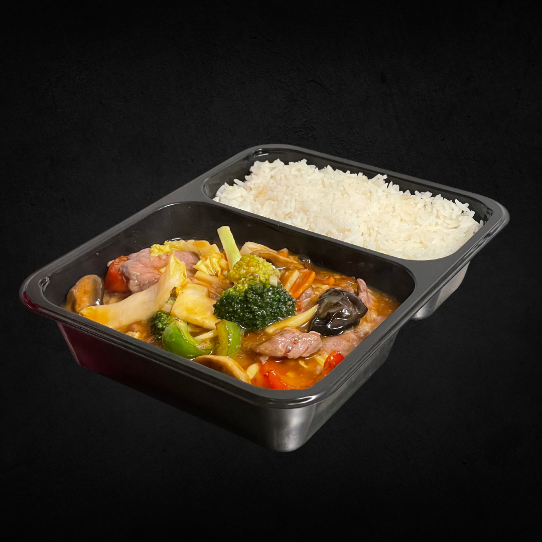 Rindfleisch, gebraten mit Gemüse in würziger Süss Sauer Sauce