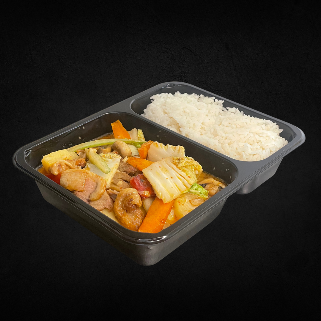 Entenfleisch, gekocht mit Gemüse in rotem Curry nach thailändischer Art (scharf)
